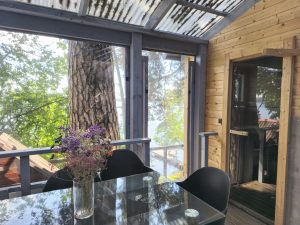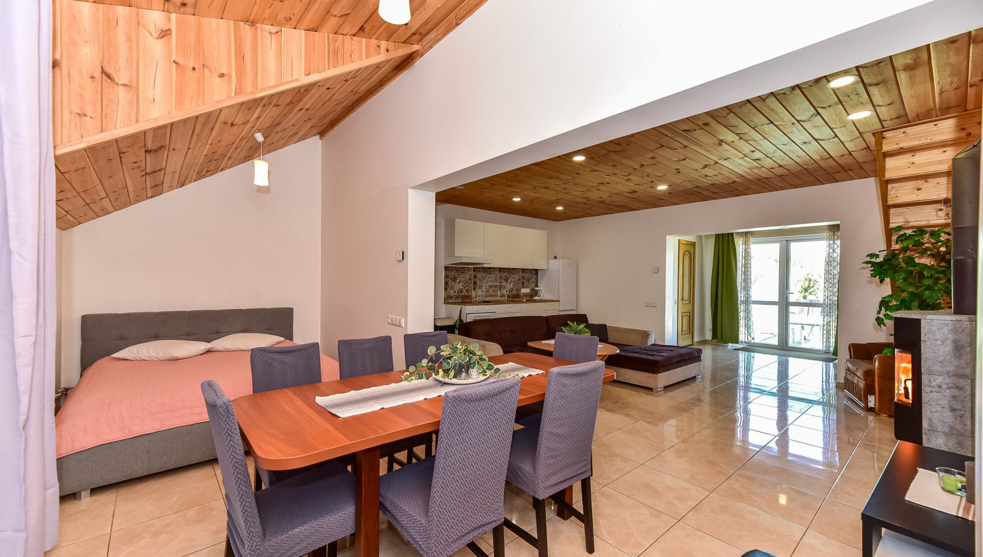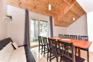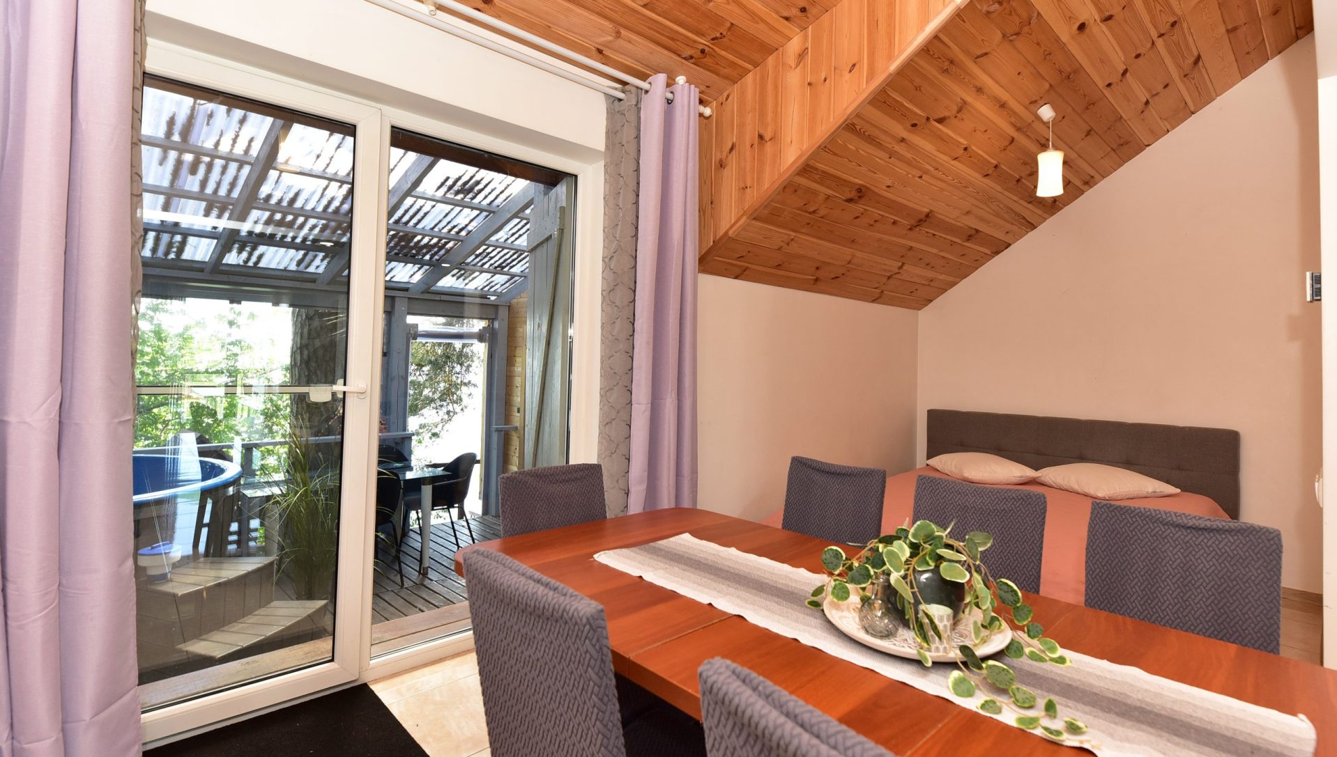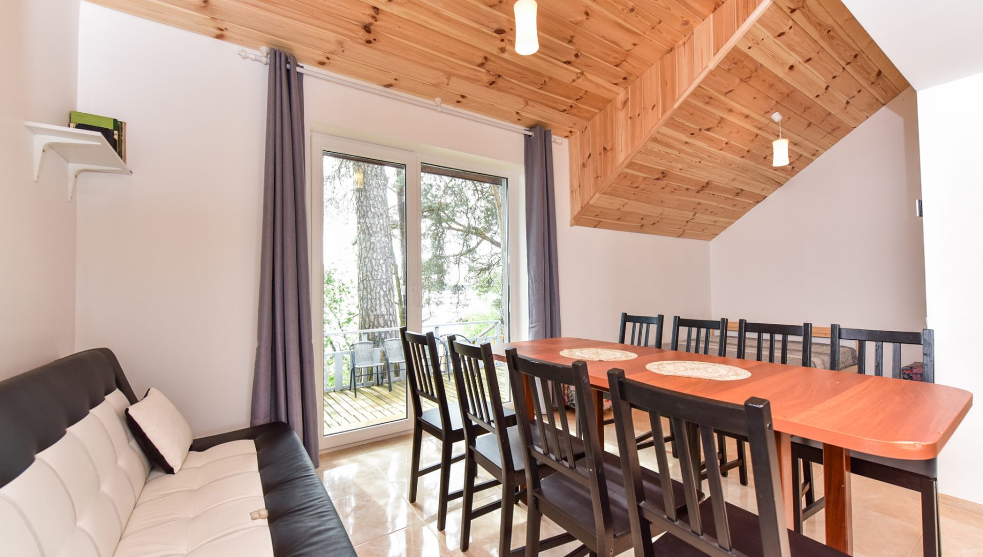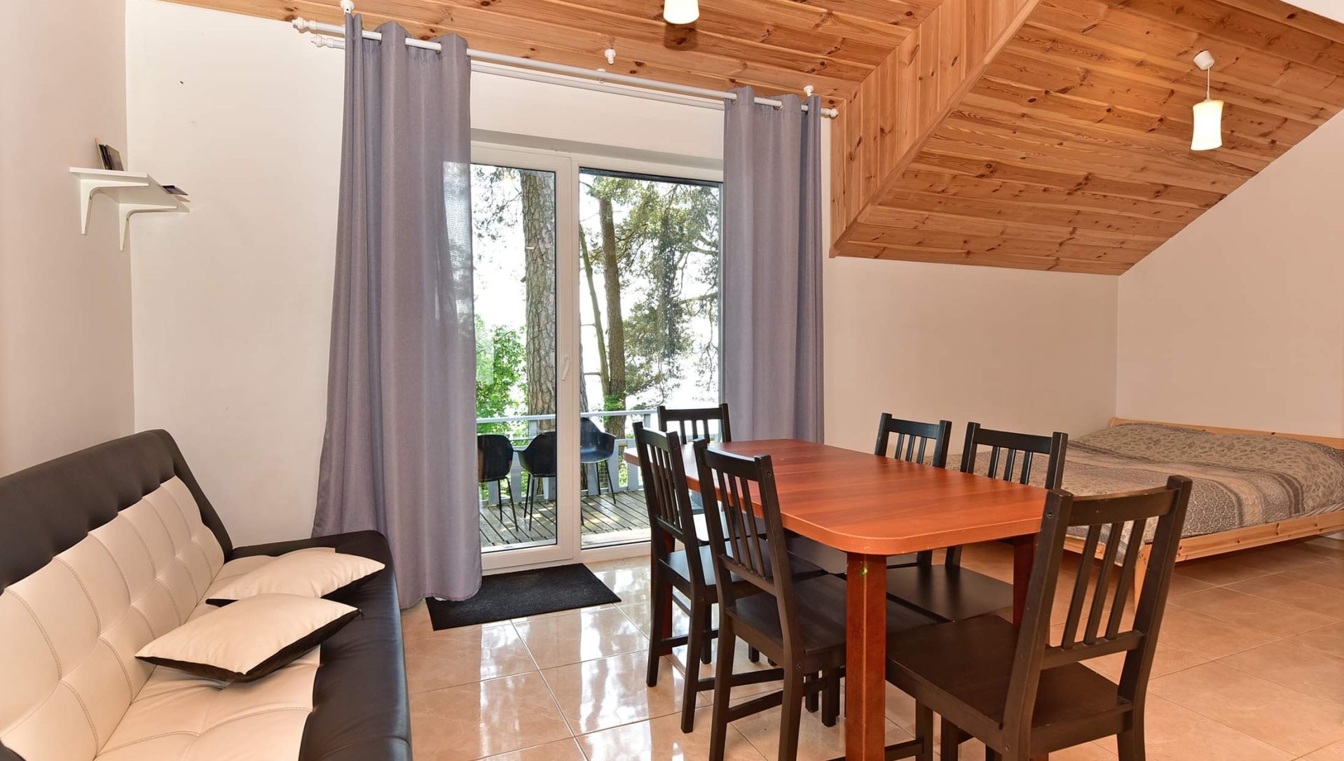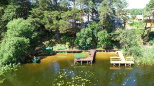 Dviejų aukštų kotedžiukas ant ežero kranto su židiniu. Pirmame aukšte svetainė su virtuve, tualetas, dušas. Įrengtas grindinis šildymas. Stovi dvigulė lova, sofa-lova, minkštas kampas, valgomasis stalas. Jaukumo suteikia židinys. Antrame aukšte trys dvigulės lovos ir viena viengulė lova. Viso kotedžiuke 8 miegamos vietos. Yra televizorius, internetas. Įrengtas kondicionierius. Įrengta terasa su kubilu ir pirtimi po stogu. Iš terasos nusileidimas laiptais iki pat ežero. Lauke pavėsinė, kurioje telpa 6-8 žmonės. Šalia vaikų žaidimų aikštelė. Įrengtas krantas maudytis bei keturi lieptai. Pakrante ir lieptais naudojasi 7A, 7B, 7C, 7D kotedžiukų gyventojai.
